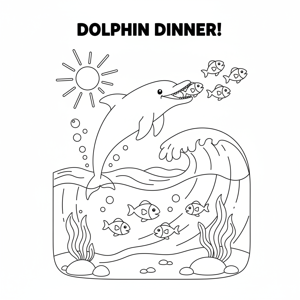 A delightful dolphin coloring page featuring dolphin catching fish dinner time. Perfect for kids and adults who love coloring!