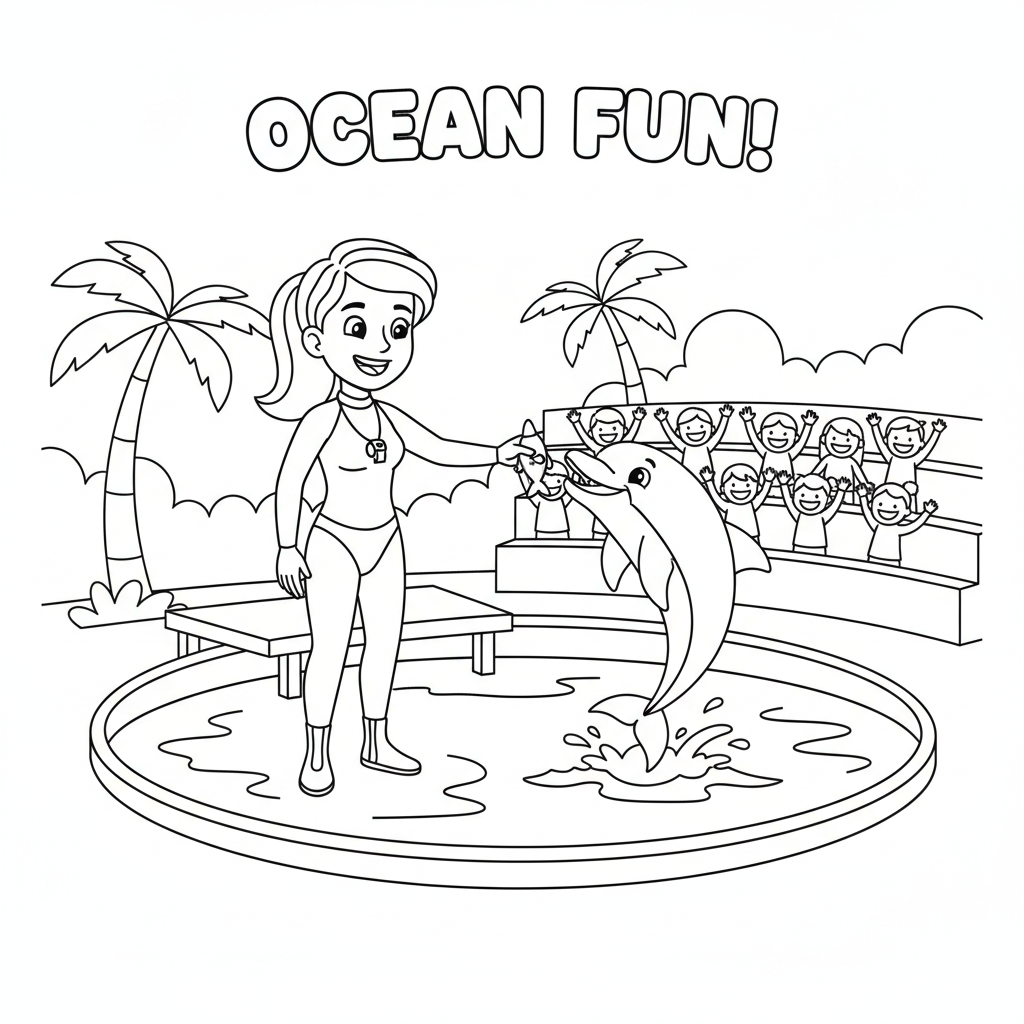 A delightful dolphin coloring page featuring dolphin trainer working marine park. Perfect for kids and adults who love coloring!