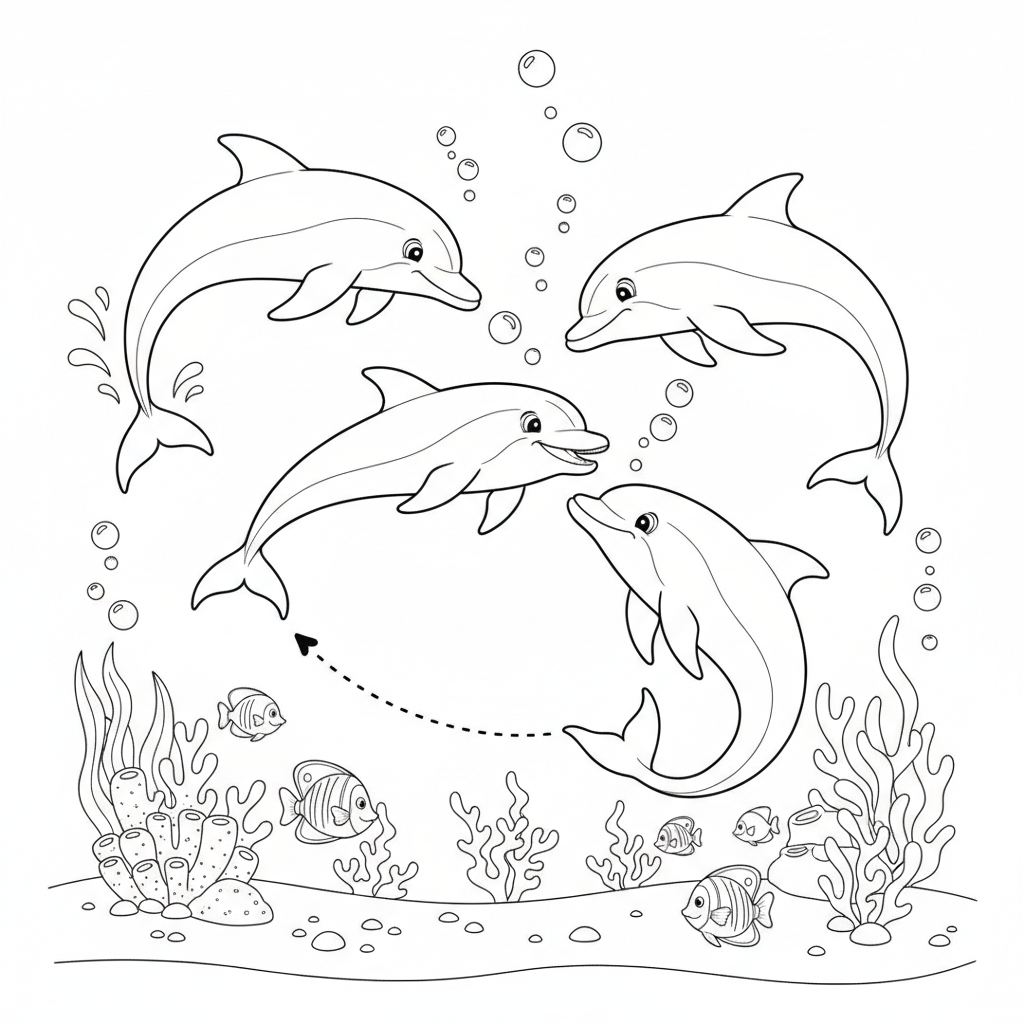 Beautiful dolphins playing tag game coloring page for kids and adults. Free to download and print.