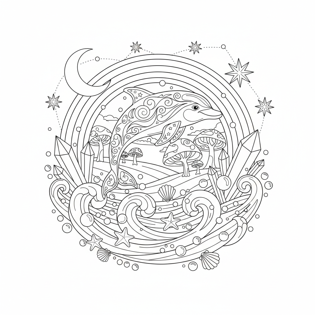 Beautiful rainbow dolphin magical scene coloring page for kids and adults. Free to download and print.