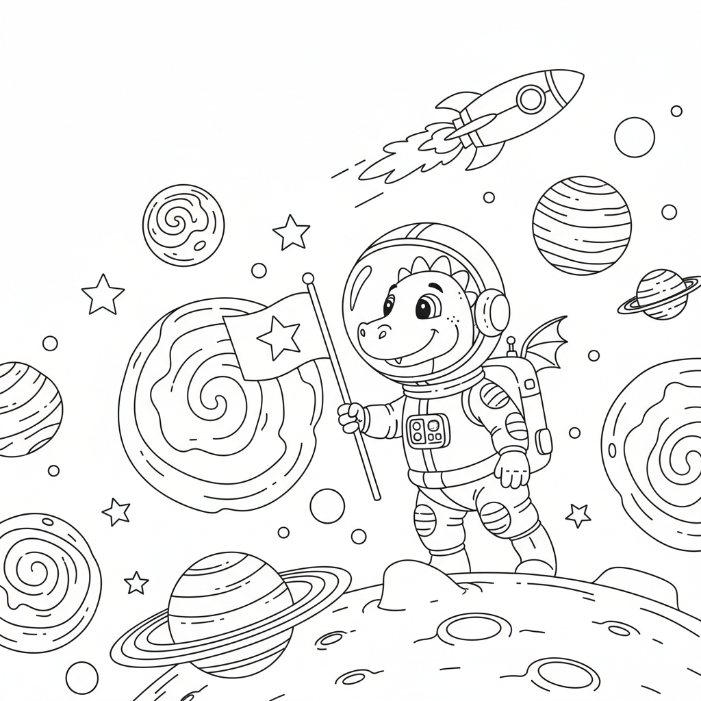 A delightful dragon coloring page featuring dragon astronaut exploring space planets. Perfect for kids and adults who love coloring!