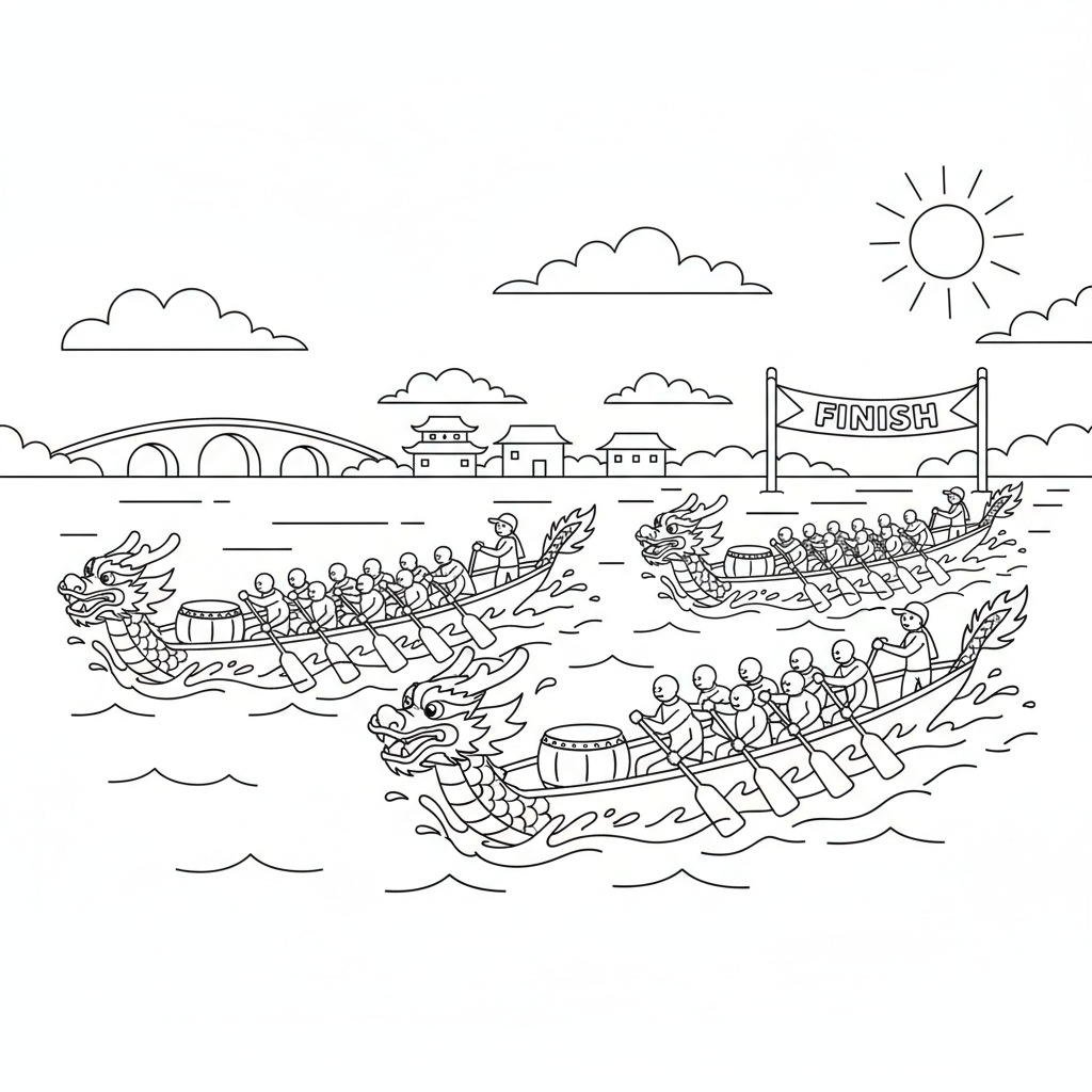 A delightful dragon coloring page featuring dragon boat racing competition water. Perfect for kids and adults who love coloring!