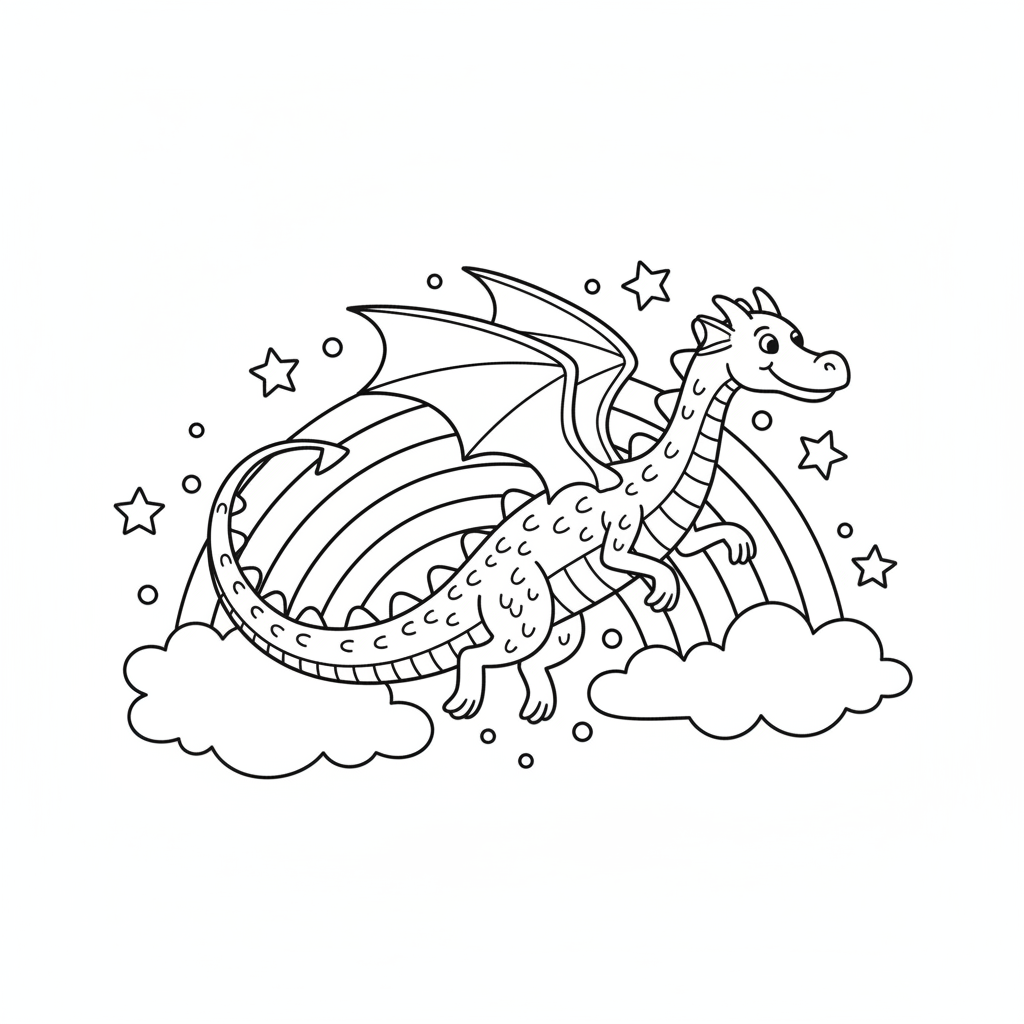 A delightful dragon coloring page featuring dragon flying through rainbow clouds. Perfect for kids and adults who love coloring!