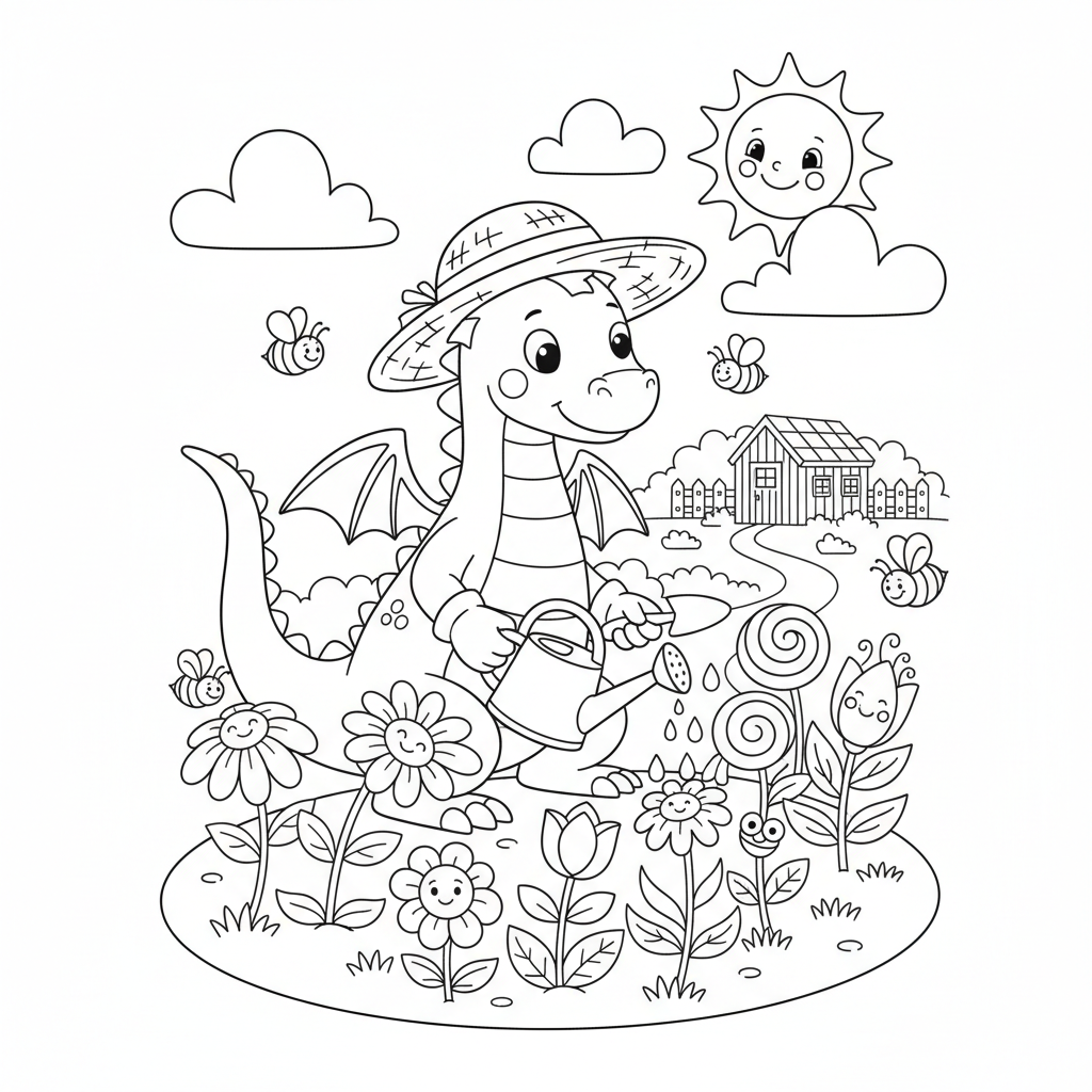 A delightful dragon coloring page featuring dragon gardener growing flowers peaceful. Perfect for kids and adults who love coloring!