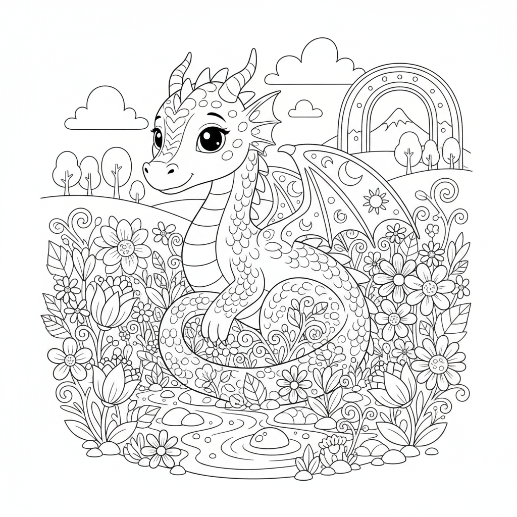 A delightful dragon coloring page featuring dragon in flower field peaceful scene. Perfect for kids and adults who love coloring!