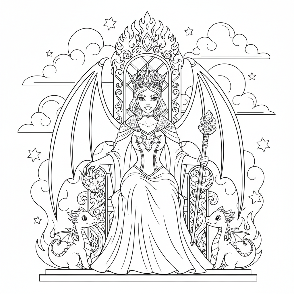 A delightful dragon coloring page featuring dragon queen on throne royal crown. Perfect for kids and adults who love coloring!