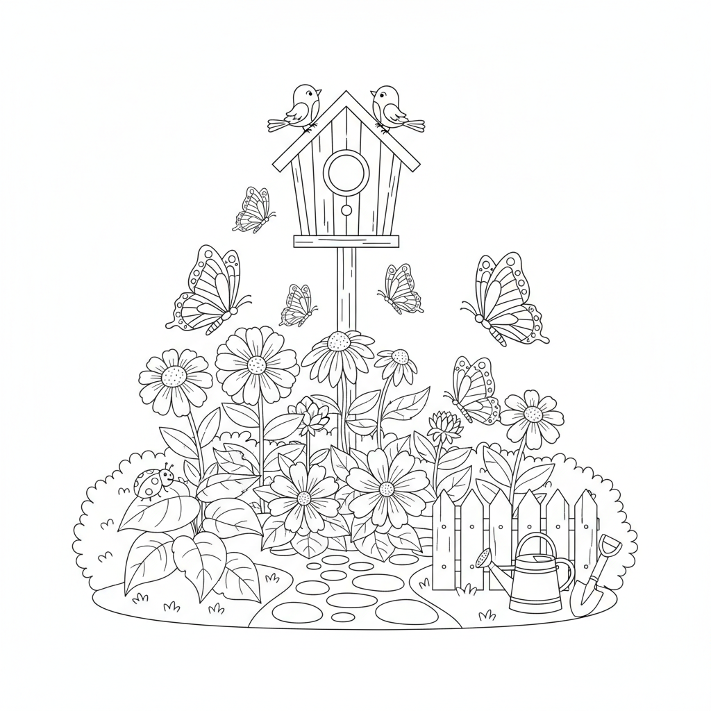A delightful earth day coloring page featuring bird house and butterfly garden in a backyard habitat. Perfect for kids and adults who love coloring!