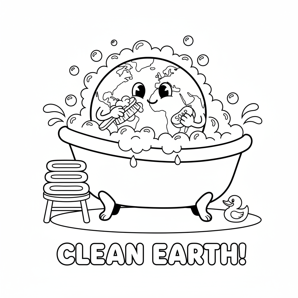 A delightful earth day coloring page featuring cartoon Earth taking a bubble bath getting cleaned up. Perfect for kids and adults who love coloring!