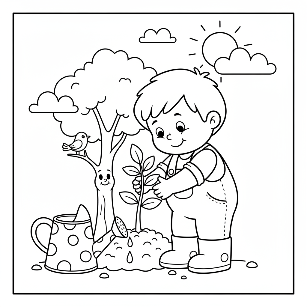 A delightful earth day coloring page featuring cartoon tree being planted by a child with a watering can nearby. Perfect for kids and adults who love coloring!