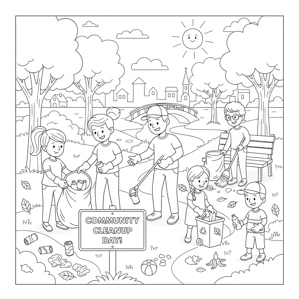 A delightful earth day coloring page featuring community cleanup day with neighbors picking up litter in a park. Perfect for kids and adults who love coloring!