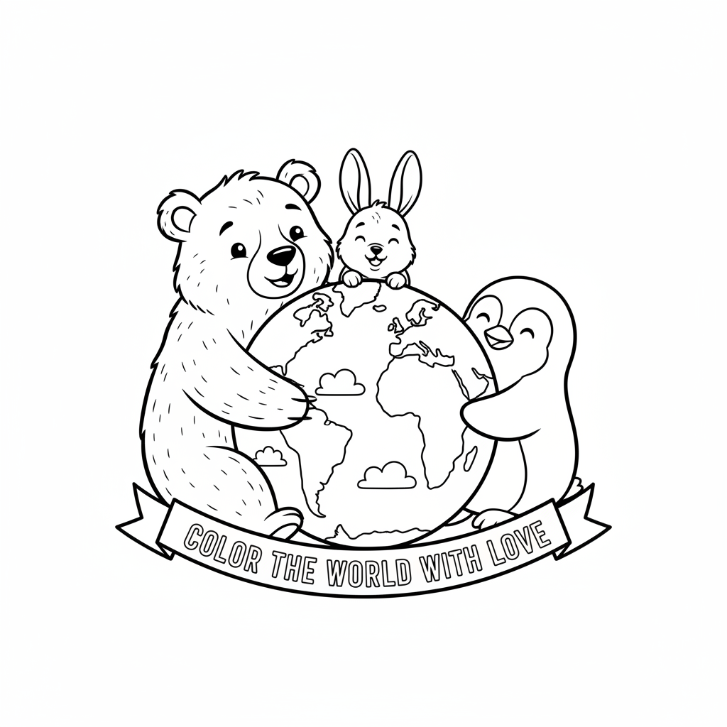 A delightful earth day coloring page featuring cute animals hugging a globe together bear penguin and rabbit. Perfect for kids and adults who love coloring!