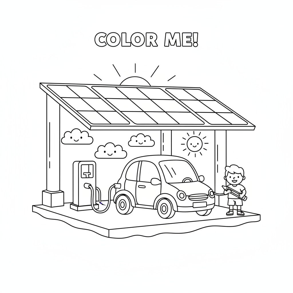 A delightful earth day coloring page featuring electric car charging at a station with solar canopy overhead. Perfect for kids and adults who love coloring!
