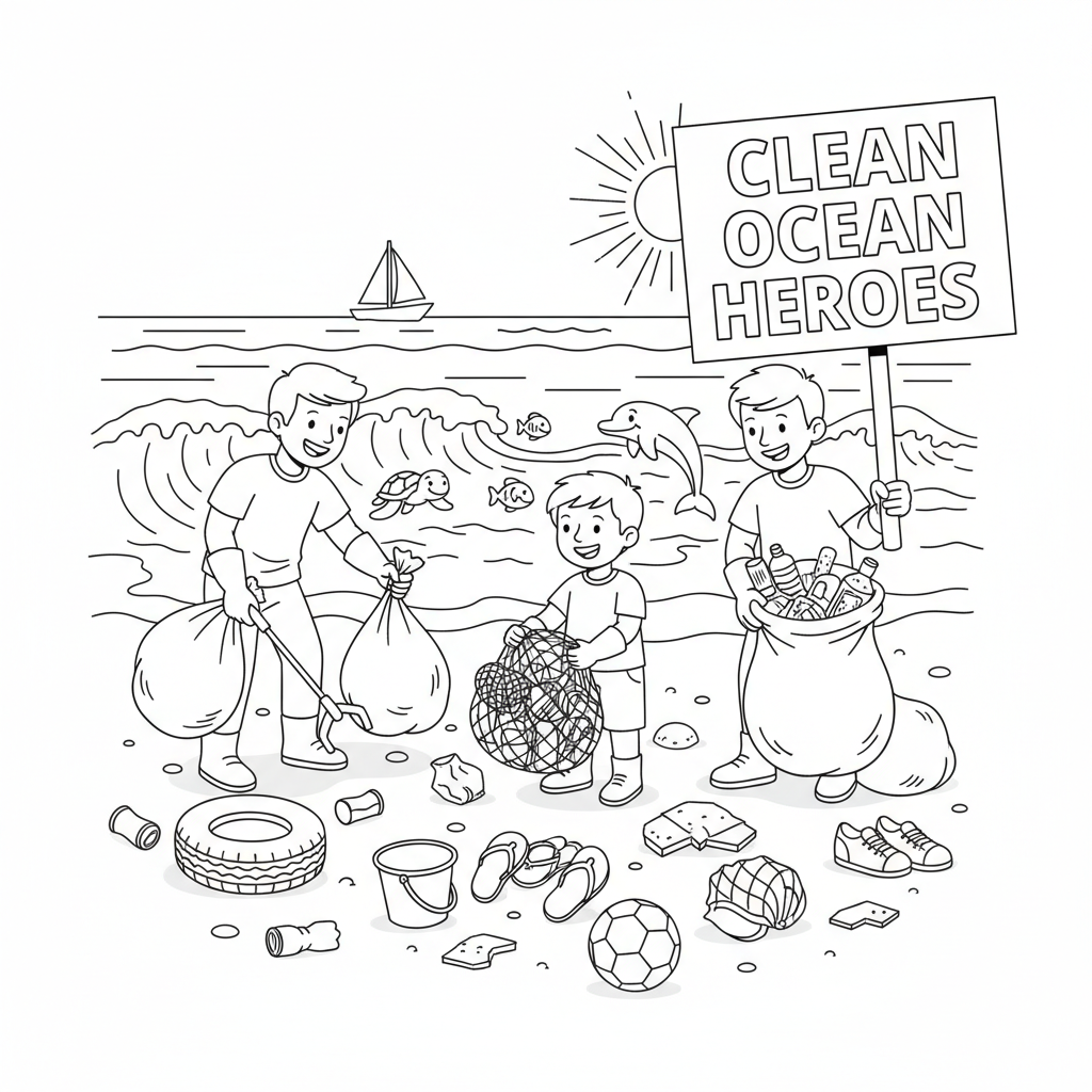 A delightful earth day coloring page featuring ocean cleanup scene with volunteers collecting trash from a beach. Perfect for kids and adults who love coloring!