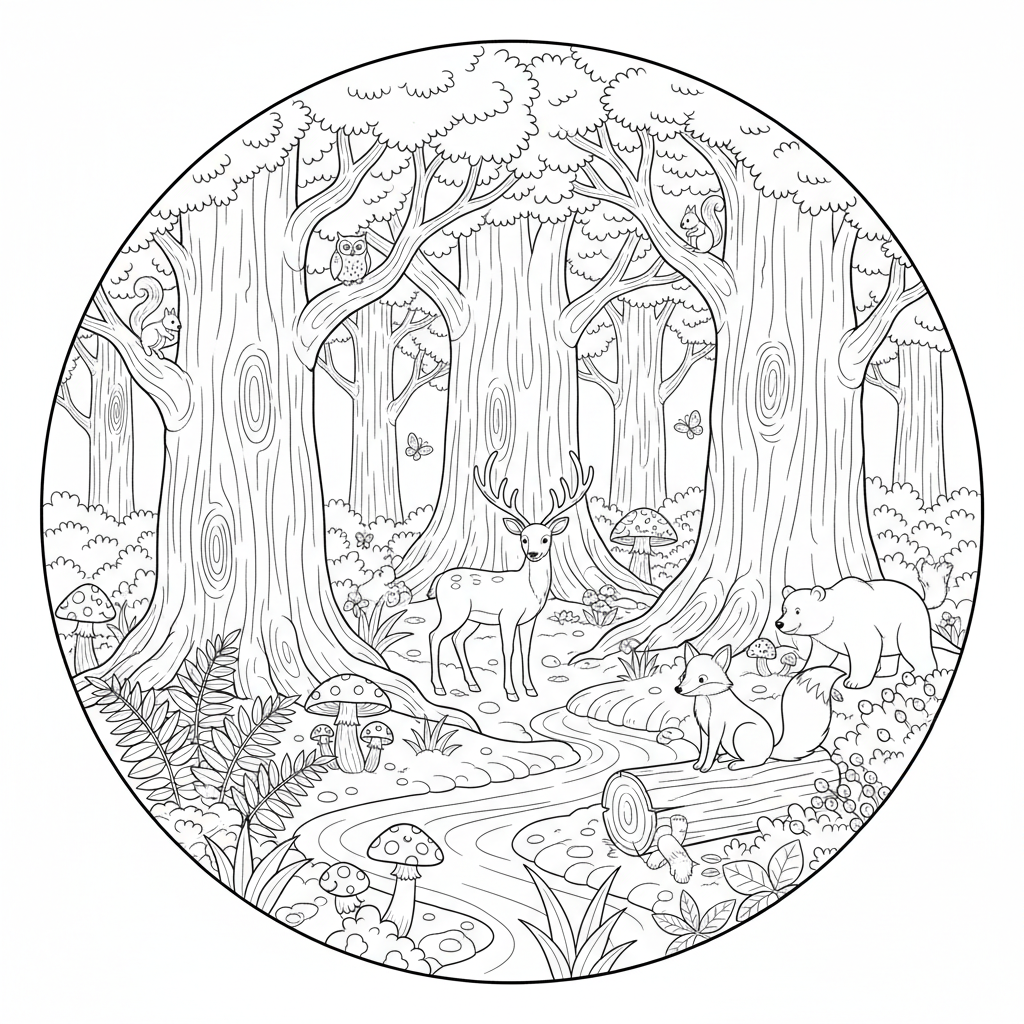A delightful earth day coloring page featuring old growth forest scene with massive trees ferns mushrooms and woodland creatures. Perfect for kids and adults who love coloring!