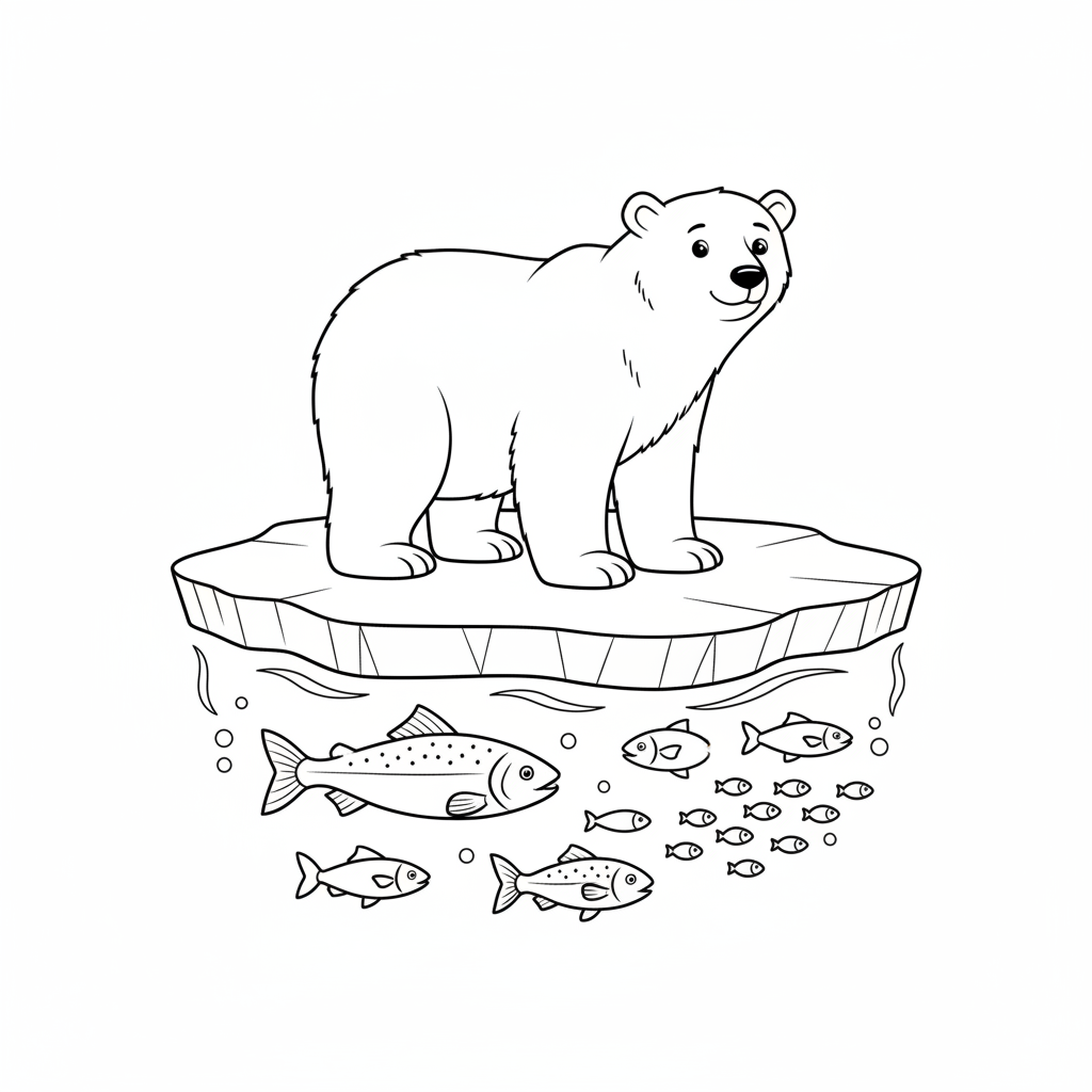 A delightful earth day coloring page featuring polar bear on healthy thick ice with clean ocean and fish below. Perfect for kids and adults who love coloring!