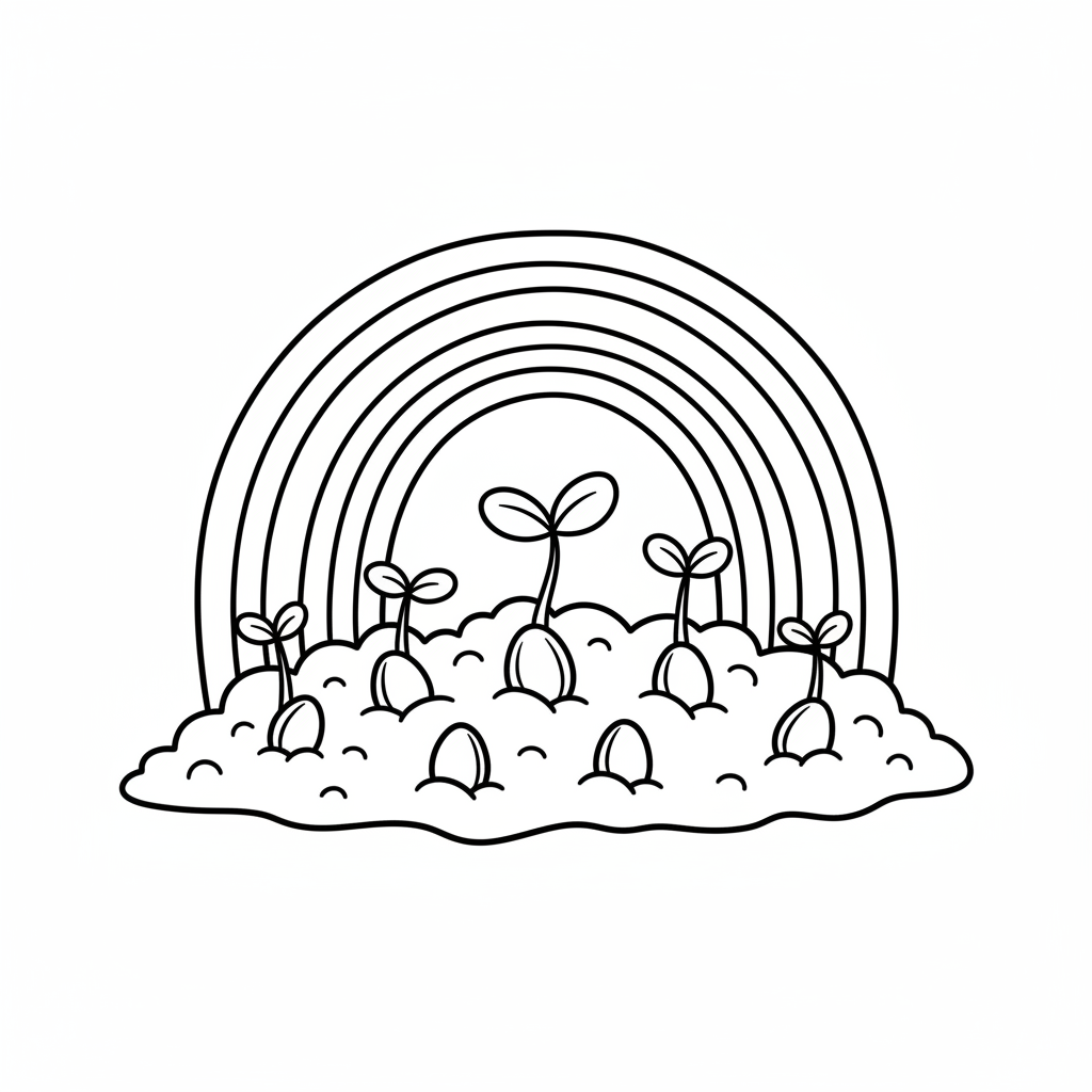 A delightful earth day coloring page featuring seeds sprouting from soil with a rainbow overhead simple outline. Perfect for kids and adults who love coloring!