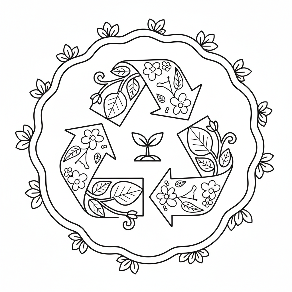 A delightful earth day coloring page featuring simple recycling symbol with arrows made of leaves and flowers. Perfect for kids and adults who love coloring!
