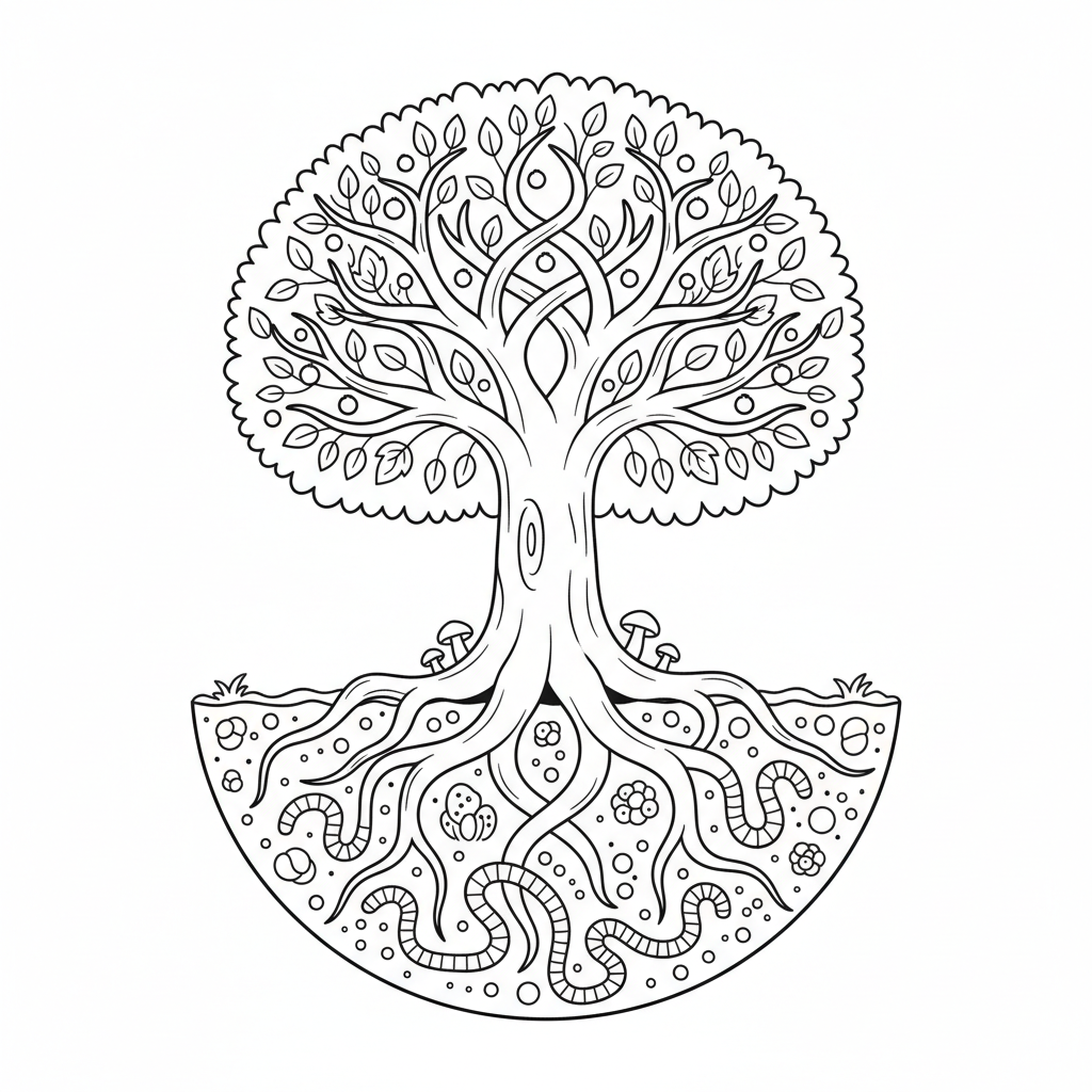 A delightful earth day coloring page featuring tree of life with roots showing underground ecosystem worms and nutrients. Perfect for kids and adults who love coloring!