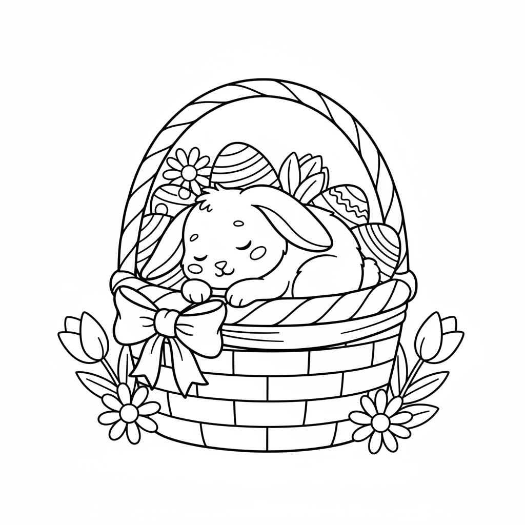 A delightful easter coloring page featuring bunny in easter basket sleeping cozy. Perfect for kids and adults who love coloring!