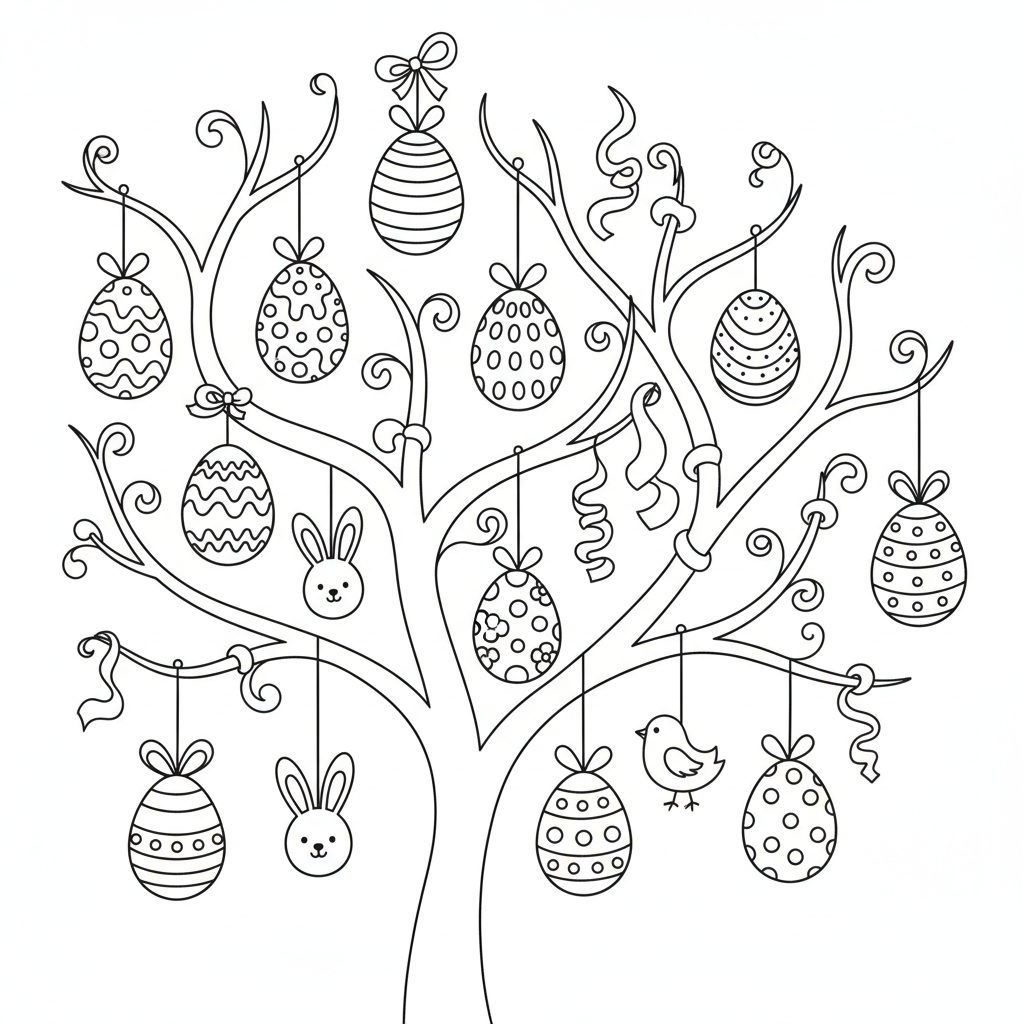 A delightful easter coloring page featuring Easter egg tree decorated branches. Perfect for kids and adults who love coloring!
