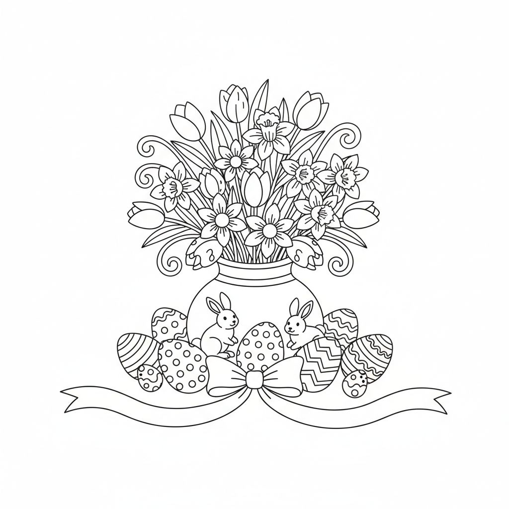 A delightful easter coloring page featuring easter table centerpiece flowers eggs. Perfect for kids and adults who love coloring!
