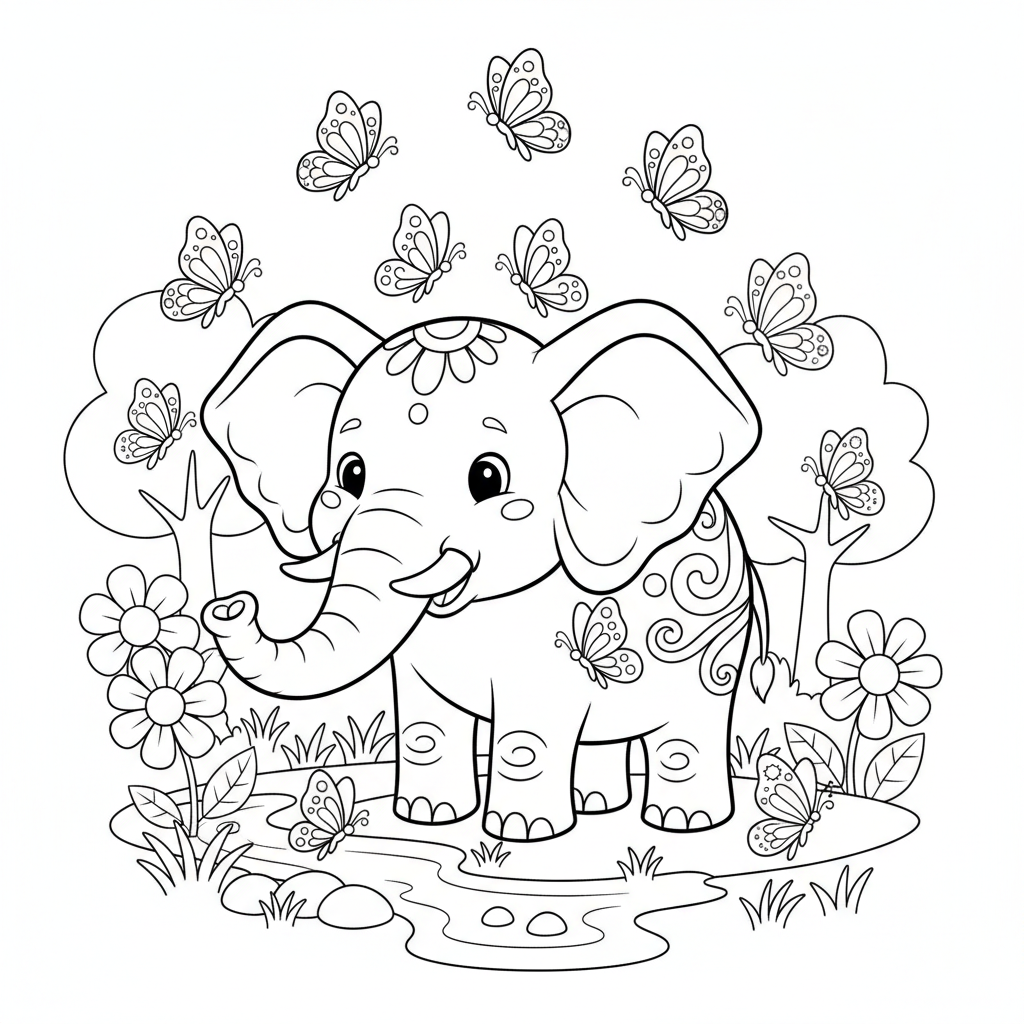 A delightful elephant coloring page featuring elephant with butterflies gentle scene nature. Perfect for kids and adults who love coloring!