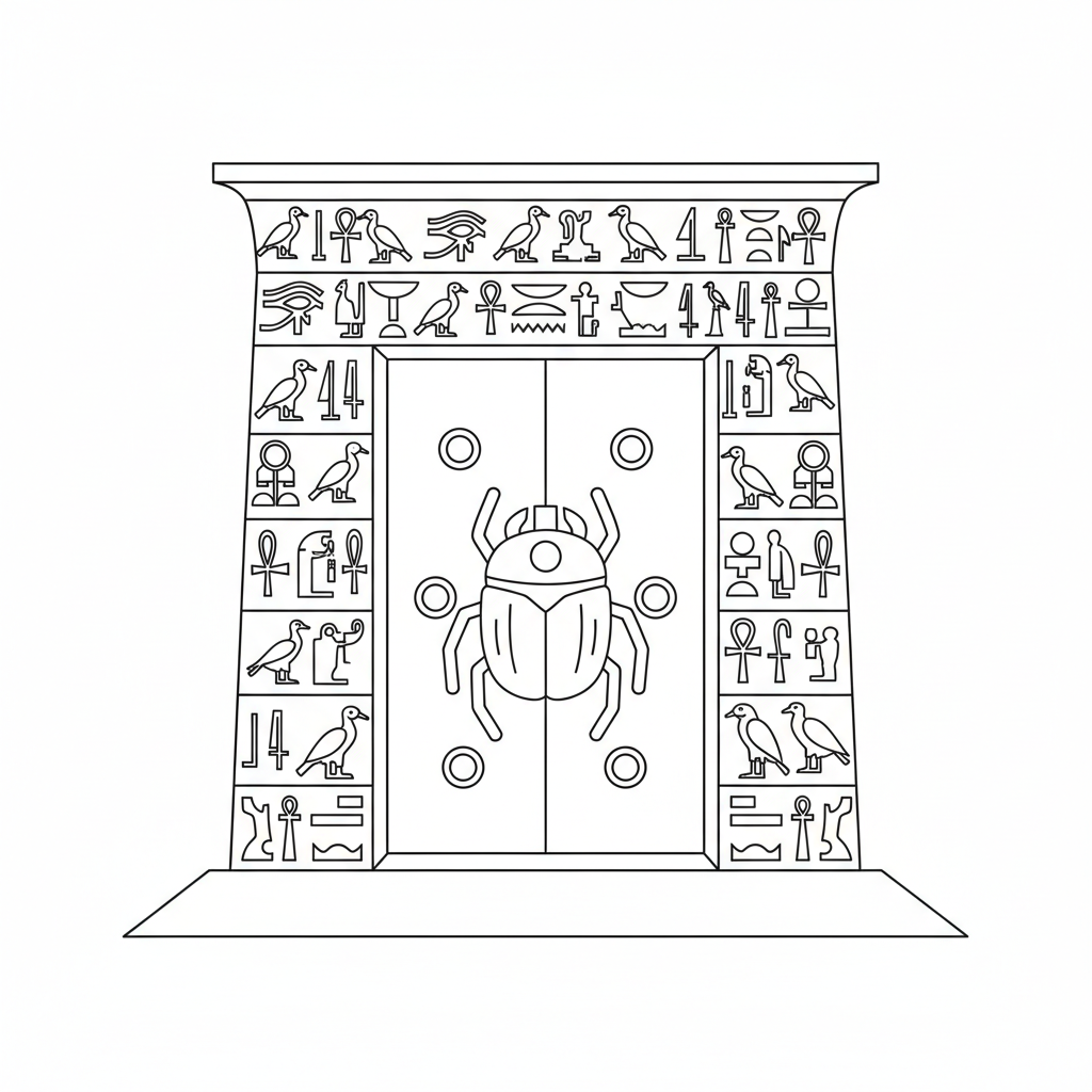 A delightful escape room coloring page featuring ancient Egyptian tomb entrance with hieroglyphic symbols around the doorway and a scarab lock. Perfect for kids and adults who love coloring!