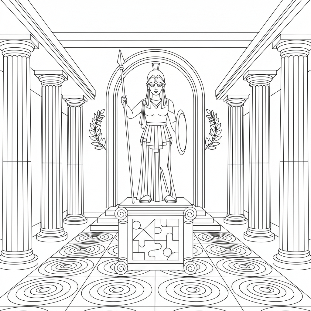 A delightful escape room coloring page featuring ancient Greek temple room with columns mosaic floor statue of Athena and a scroll puzzle on an altar. Perfect for kids and adults who love coloring!