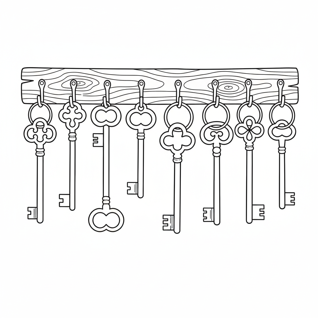 A delightful escape room coloring page featuring collection of old-fashioned keys of different shapes and sizes hanging on a wooden board. Perfect for kids and adults who love coloring!