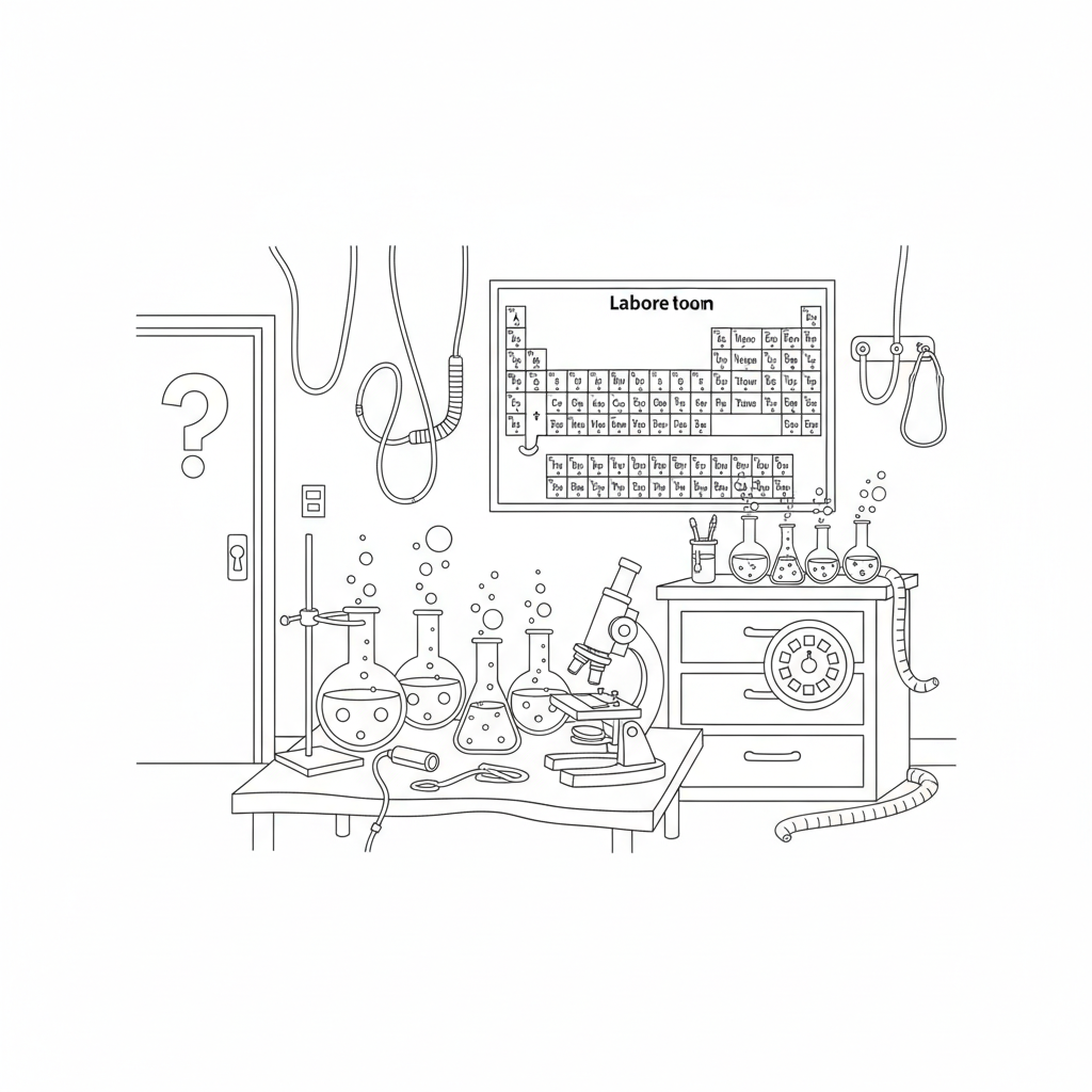 A delightful escape room coloring page featuring laboratory escape room with bubbling beakers microscope periodic table poster and a coded lock on a drawer. Perfect for kids and adults who love coloring!