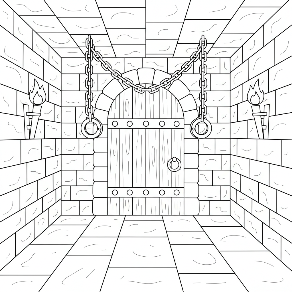 A delightful escape room coloring page featuring medieval castle dungeon with stone walls torch sconces chains and a wooden door with iron bolts. Perfect for kids and adults who love coloring!