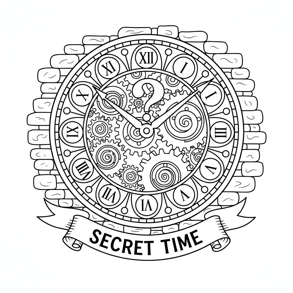 A delightful escape room coloring page featuring mysterious clock on the wall with its hands pointing to a secret time and gears visible. Perfect for kids and adults who love coloring!