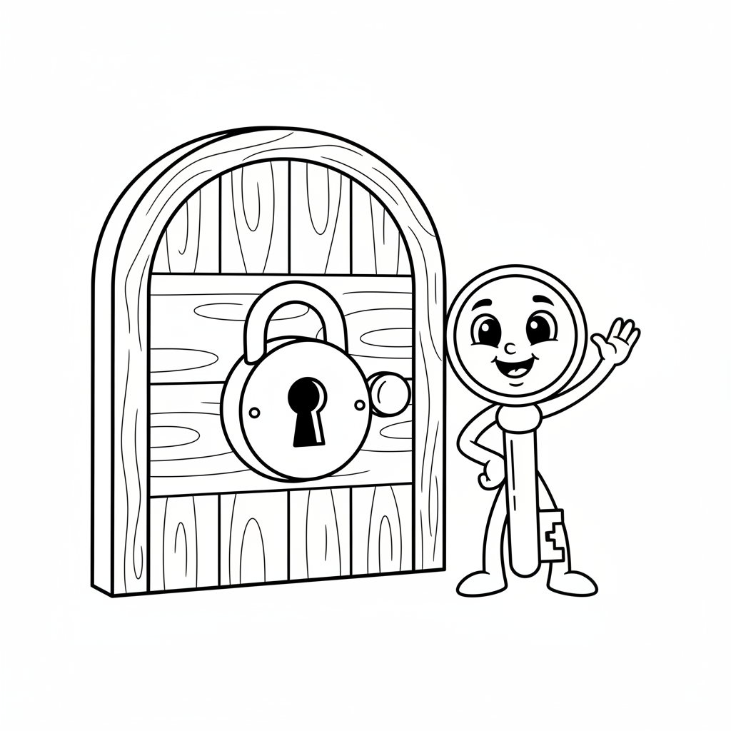 A delightful escape room coloring page featuring simple cartoon door with a big padlock and a friendly key character smiling beside it. Perfect for kids and adults who love coloring!