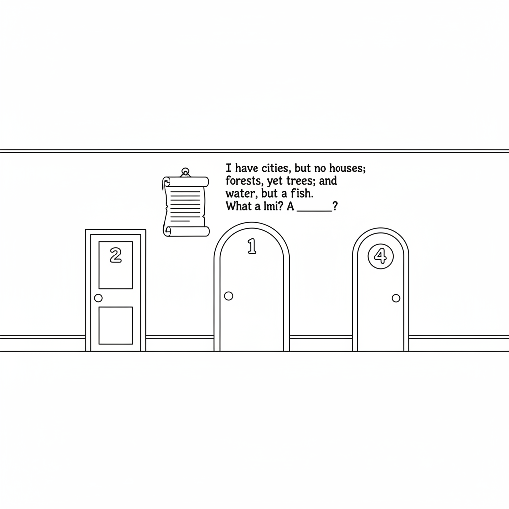 Simple room with four numbered doors and a riddle scroll hanging on the wall