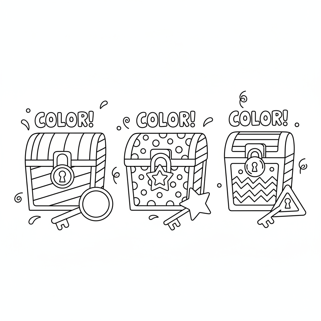A delightful escape room coloring page featuring three colorful locked boxes each with a different shaped keyhole circle star and triangle. Perfect for kids and adults who love coloring!