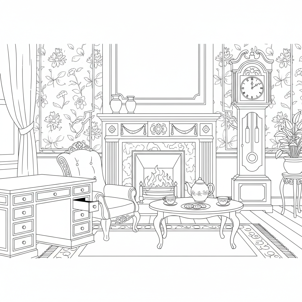 A delightful escape room coloring page featuring Victorian parlor room with ornate fireplace grandfather clock tea set and hidden drawer in furniture. Perfect for kids and adults who love coloring!