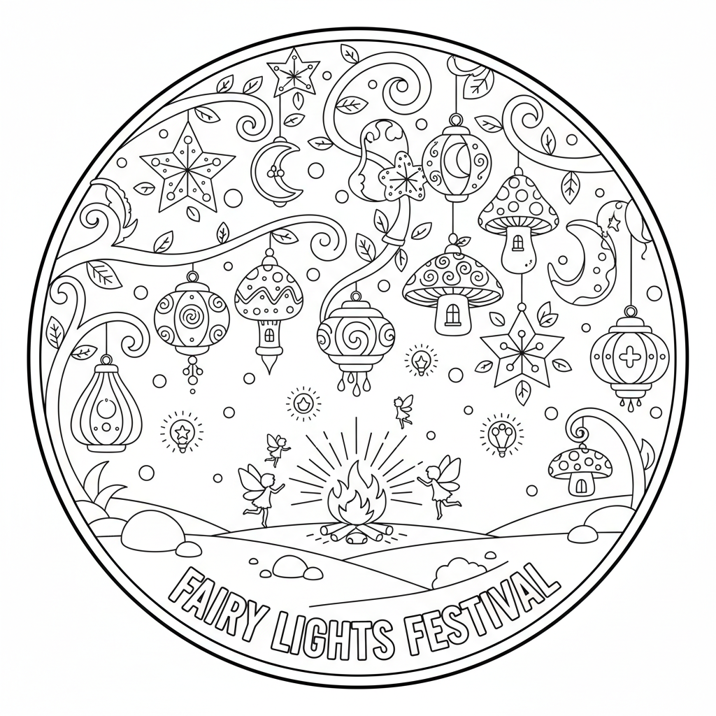 A delightful fairy coloring page featuring fairy celebration festival lights lanterns. Perfect for kids and adults who love coloring!