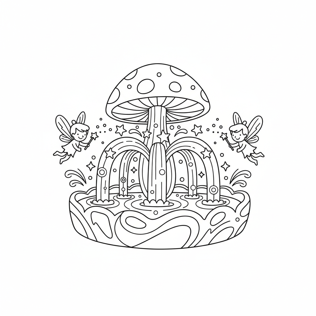 A delightful fairy coloring page featuring fairy fountain magic water sparkling. Perfect for kids and adults who love coloring!