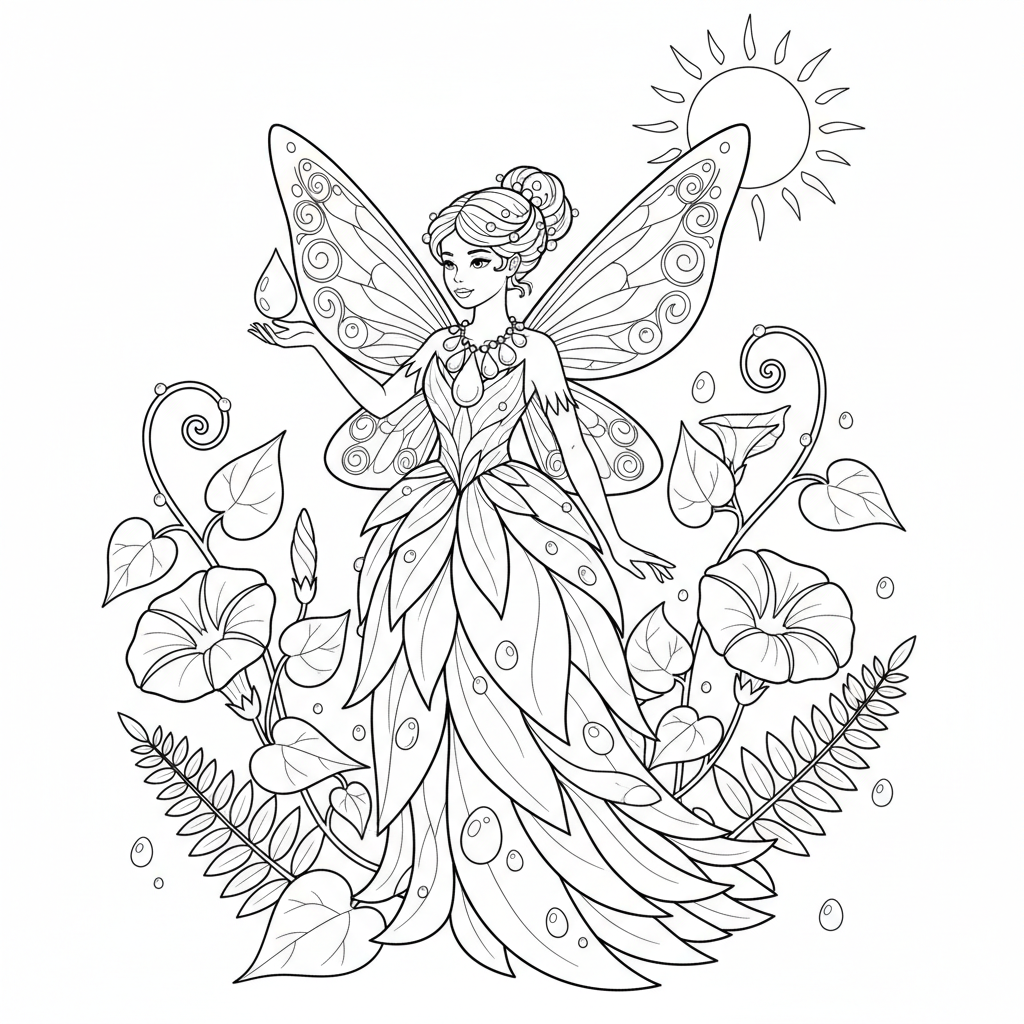 A delightful fairy coloring page featuring fairy with dewdrop necklace jewelry morning. Perfect for kids and adults who love coloring!