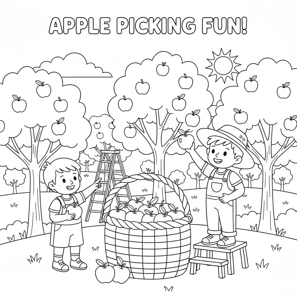 A delightful fall coloring page featuring apple orchard picking apples basket full. Perfect for kids and adults who love coloring!