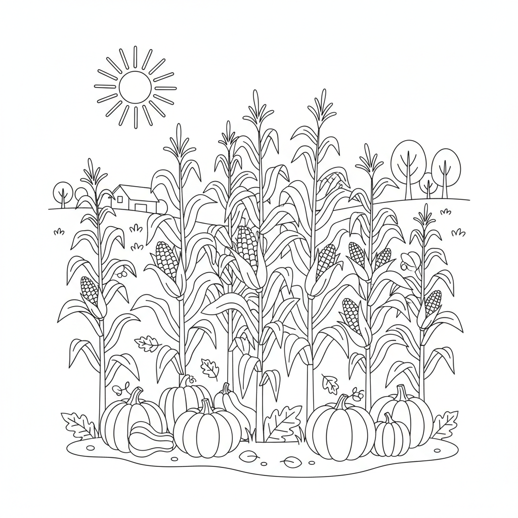 A delightful fall coloring page featuring corn stalks in autumn field golden. Perfect for kids and adults who love coloring!