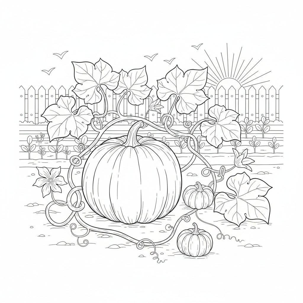 Beautiful pumpkin growing on vine in garden coloring page for kids and adults. Free to download and print.