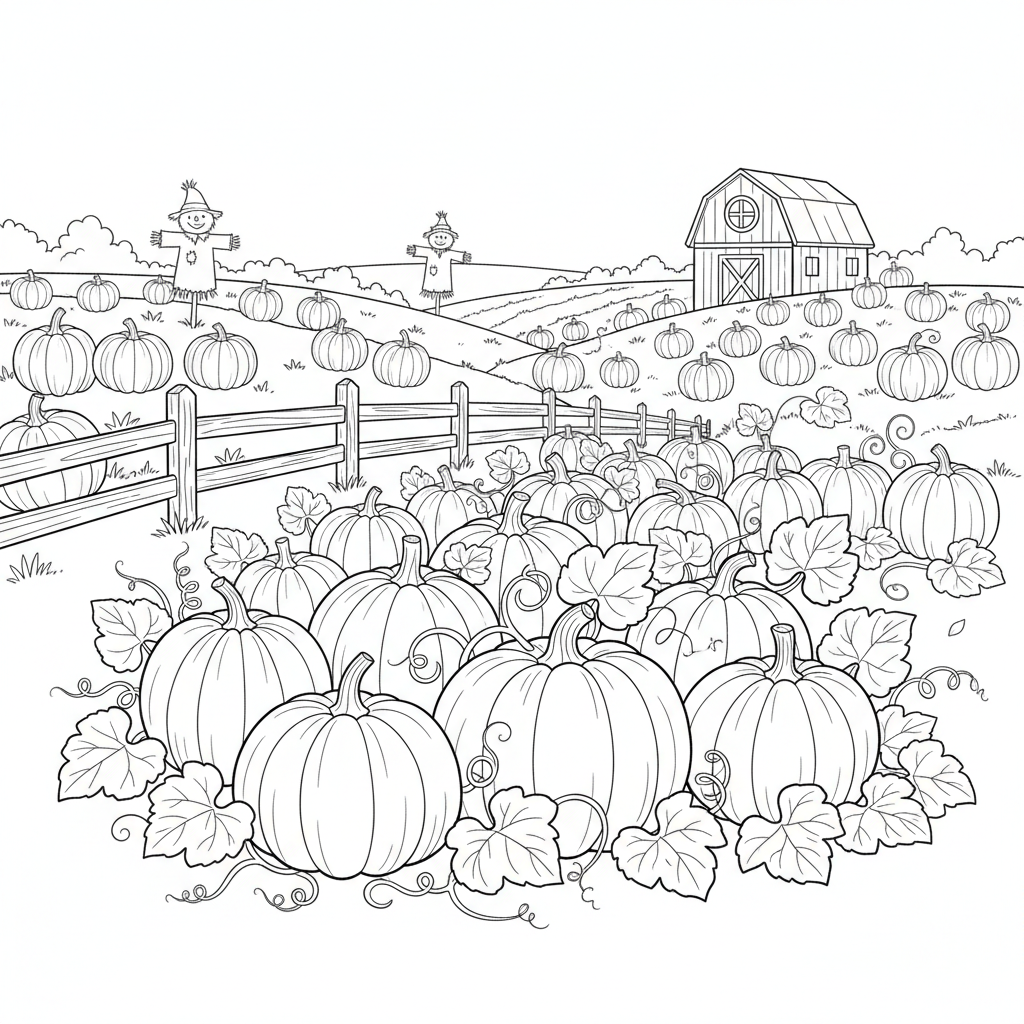 Beautiful pumpkin patch with many pumpkins coloring page for kids and adults. Free to download and print.