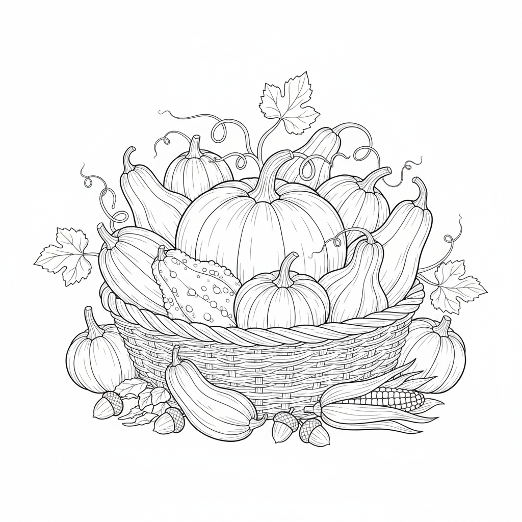 Beautiful pumpkins and gourds arrangement coloring page for kids and adults. Free to download and print.