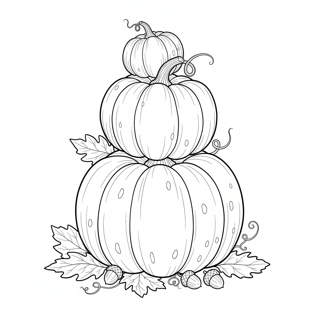 Beautiful stack of pumpkins different sizes coloring page for kids and adults. Free to download and print.