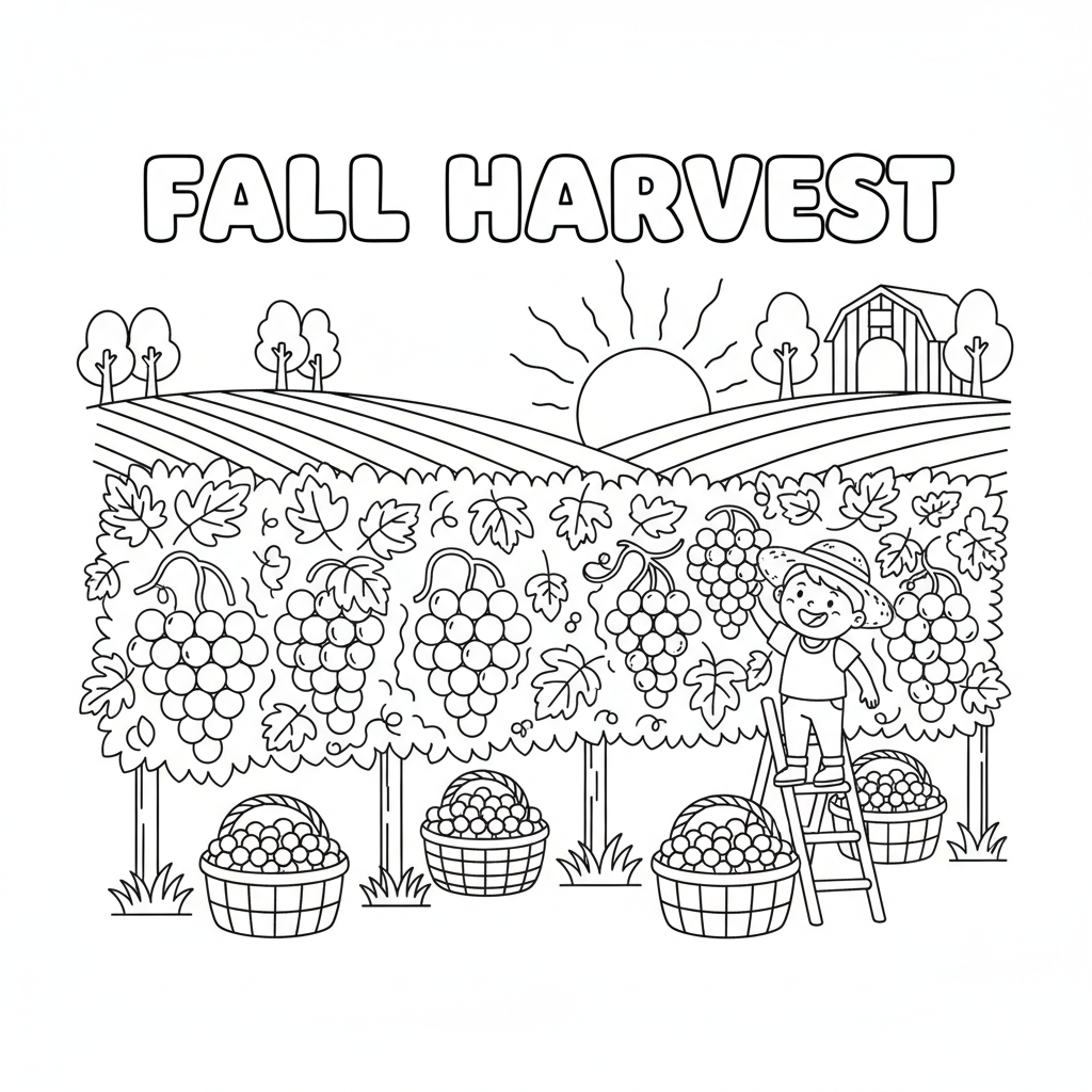 A delightful fall coloring page featuring vineyard with grapes in fall harvest. Perfect for kids and adults who love coloring!