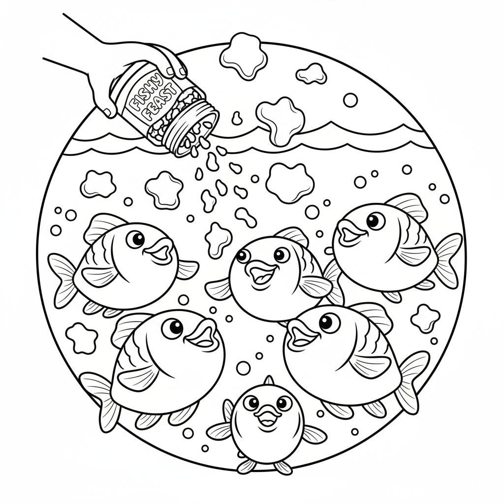 A delightful fish coloring page featuring fish food flakes feeding time hungry. Perfect for kids and adults who love coloring!