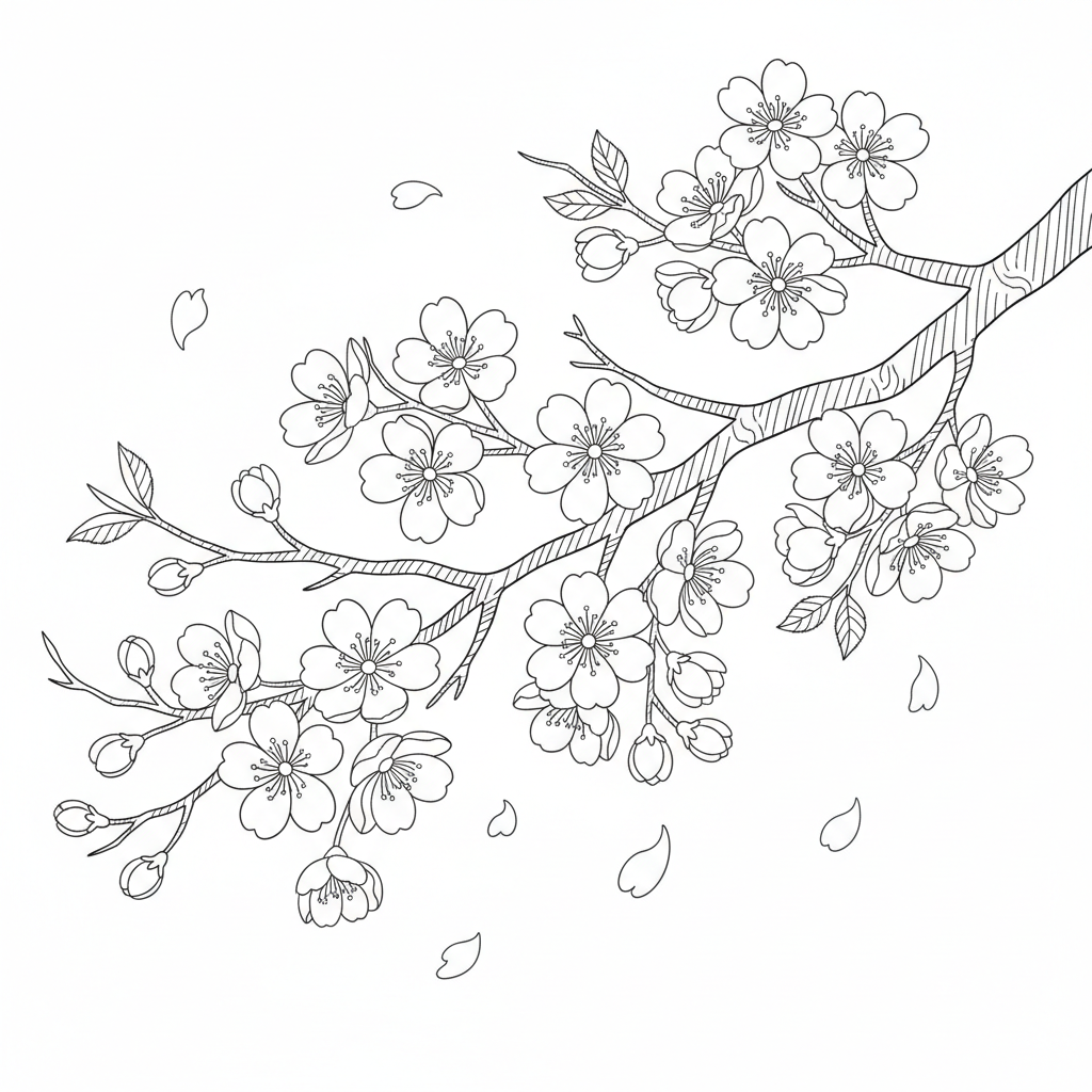 Beautiful cherry blossom tree branch coloring page for kids and adults. Free to download and print.