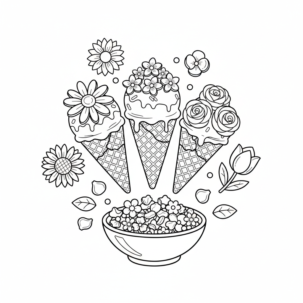 A delightful flower coloring page featuring flower ice cream edible decorations. Perfect for kids and adults who love coloring!