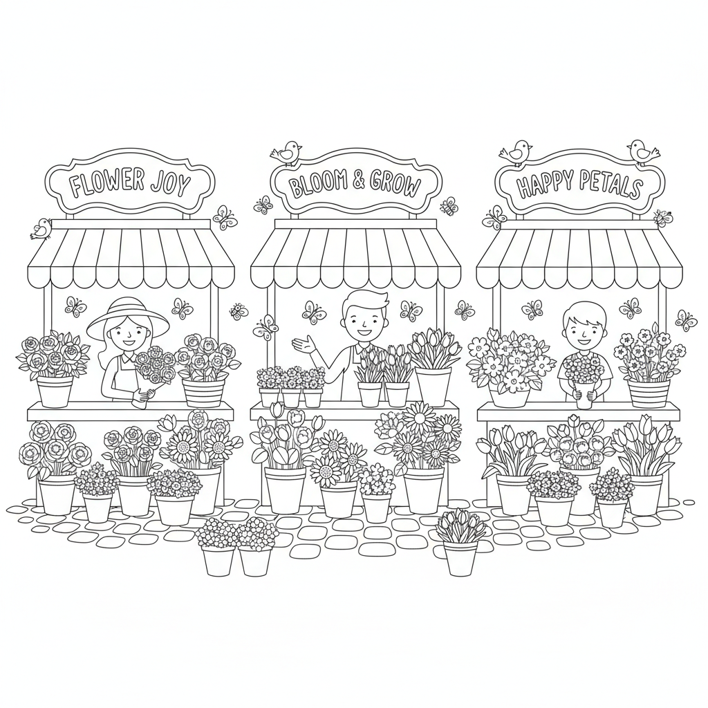 A delightful flower coloring page featuring flower market stalls vendors colorful. Perfect for kids and adults who love coloring!